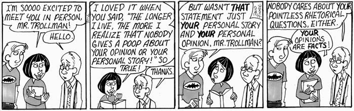 I had been fishing around for a way to deal with him in the Mr. Fitz comic strip, and decided the best way was the simplest. Simply throw him into the strip as a character – now named Dylan Trollman – and let Mr. Fitz have a chat with him at a teaching conference. To contrast Mr. and Mrs. Fitz’s attitude, I added Mrs. Merritt to the mix. As the education reformers’ ideal teacher, she is a positive standards junky and Trollman groupie.