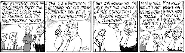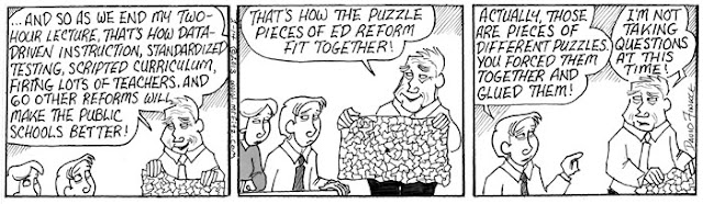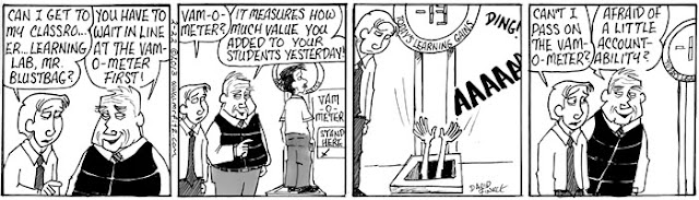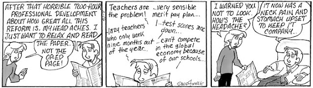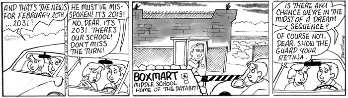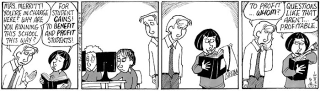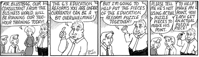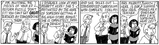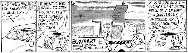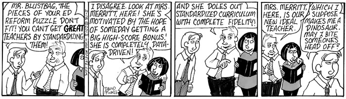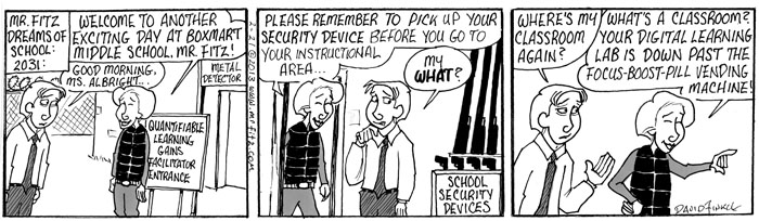 This February I decided to take my comic strip, Mr. Fitz, in a direction I’d never taken it: Dystopian Science Fiction. Upon hearing that some other education commentators, including Anthony Cody and Steven Krashen, have been writing about the possible future of public education (which is not a pretty picture), I thought this series might make a nice compliment to their pieces. It leads into another series about teacher depression which I’ll post later with some additional commentary. For now, please share this, especially with parents who don’t know what’s at stake here…