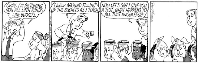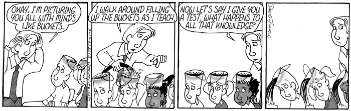 This testing culture leads, ironically, to a lack of real thinking about instruction. It leads teachers and students alike to not really think about their subjects in a deep and meaningful way, but to be compliant, to assume the rubrics and curriculum maps and textbooks and test prep materials will tell them all they need to know. It leads to a culture like the one I illustrated here, where the human mind is like a bucket, and knowledge is dumped out onto a test and forgotten.