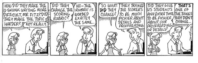 But did they change the conditions? No. All they changed was how the rubric was used. I was going to touch on this issue of the rubric in the strip, but I decided it would be getting a little two technical for my general newspaper audience. Nonetheless, the question remains, if rubrics are useful because of their objectivity and their clear guidelines for students and scorers, then how can you take the same exact rubric and get a very different scoring result? For nearly 20 years, teachers have been using a 6 point rubric to score writing. They have gotten really good at scoring using that rubric, for good or ill. But now, this far into the program, the state decides that without changing a single phrase, word, or punctuation mark of the rubric, you must use it differently. It gives lie to the whole concept of rubrics as objective.