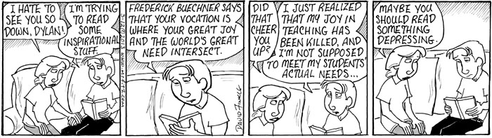 Before I ran this series, I asked a question on my Mr. Fitz Facebook page. This sounds like a downer, and you don’t have to give away who, but how many of you know a teacher who has suffered or is suffering from, a bout of depression because of what is happening to our profession? I’m curious. I have, and I’m addressing it in the strip soon.That question resulted in 98 responses, unprecedented for my little Facebook page. Every single one of them was affirmative– yes they knew depressed, stressed teachers. Many of them admitted it was them. And most of them knew people who had thought about leaving the profession.