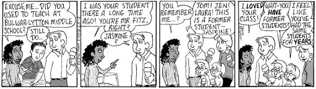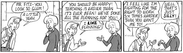 In the comic strip, Mr. Fitz has a nightmare about the possible future of schools (which I have posted here as well), and wakes up depressed. The plot resumes here on the day after his nightmare.