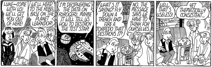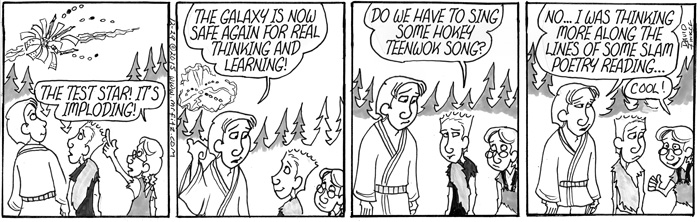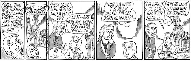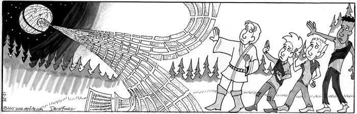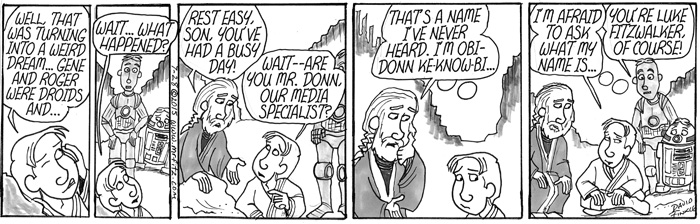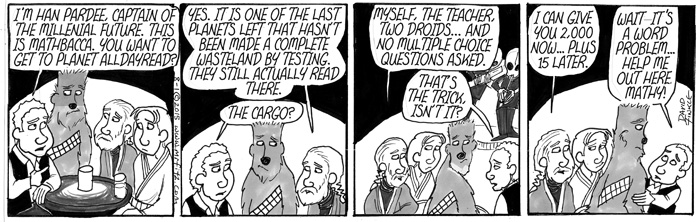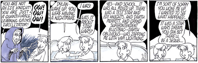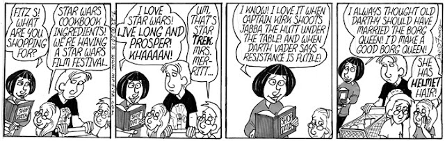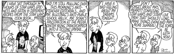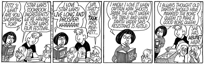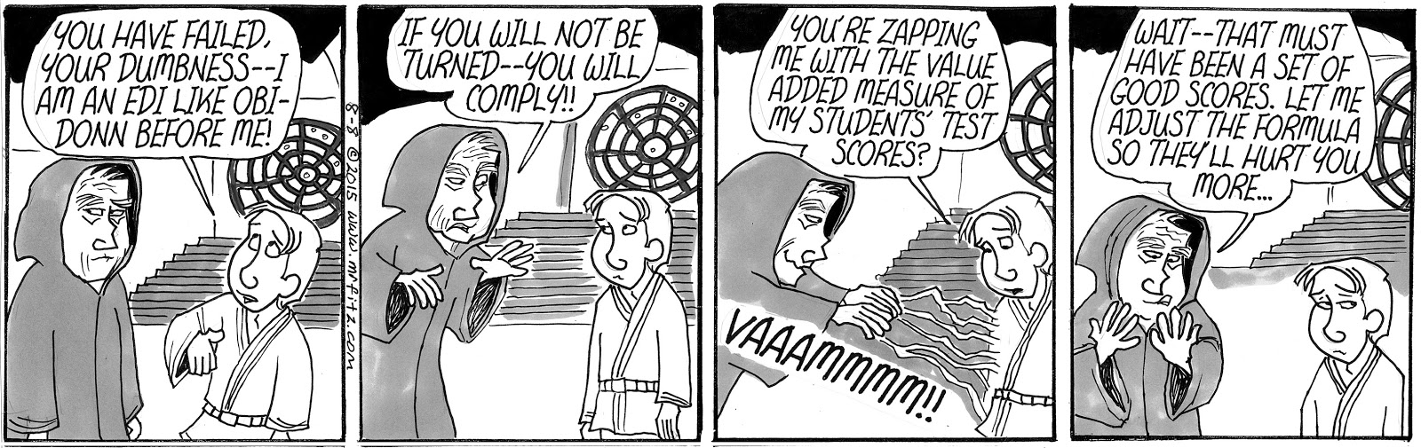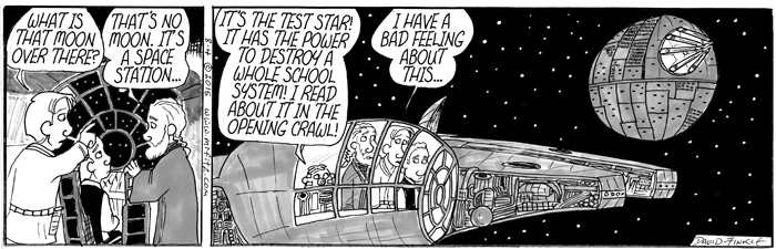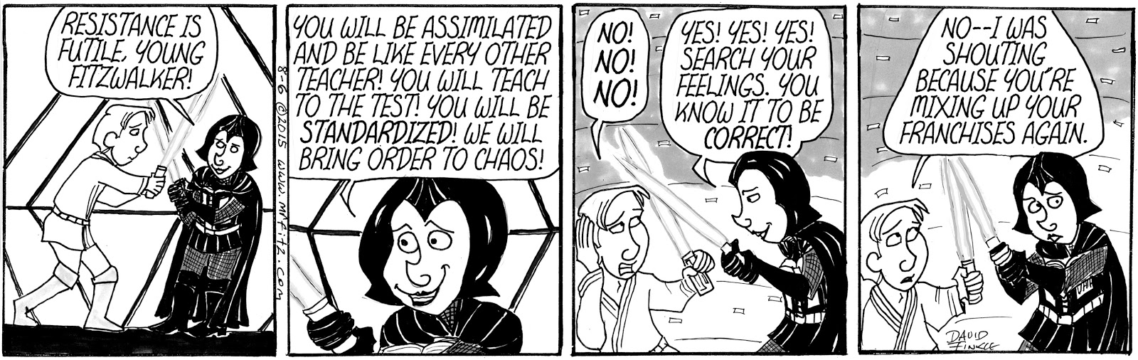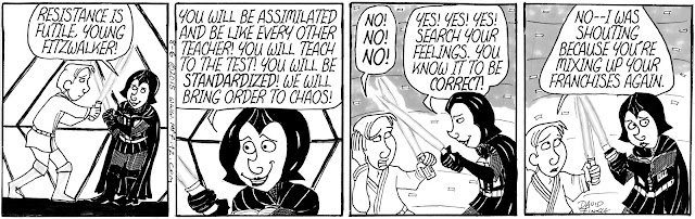 As I began to think about the politics within the Star Wars universe, the role the Jedi Knights played in the Old Republic, and the role of the Empire in using fear to create a totalitarian galaxy, I realized I needed to use my comic strip, Mr. Fitz, to write a parody of Star Wars that was also a satire of American Education Reform over the past two decades. I have sometimes felt like old Obi-Wan, hiding out in my cave-class, following the old ways of the Force as I did before the dark times, before the Empire of testing. Of course, some other science fiction and pop culture elements started to seep into the series as well, especially the Borg from Star Trek: The Next Generation.