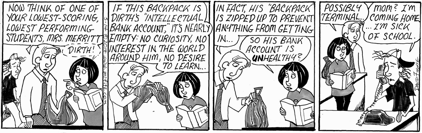 What makes a student, or any person smart? I decided to have Mr. Fitz answer the question in a debate with the education reform movement’s ideal teacher, Mrs. Merritt. Their debate takes place in the context of a metaphor: the human mind as a backpack.