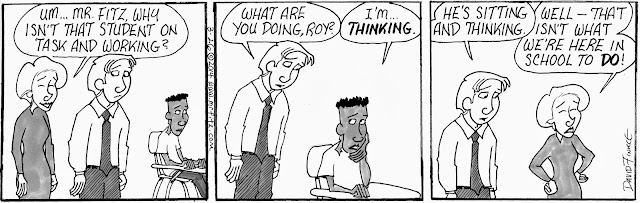 But you wouldn’t know that, based on a lot of what is being done in and to schools these days. These days, we seem to spend a lot of time asking adults and children to not think, to help them avoid thinking. We want things to be nailed down, settled, fired in a kiln into their final shape so that we can avoid having to really think about them. Many people give lip service to thinking, but don’t really like it when it occurs.